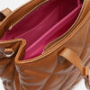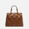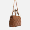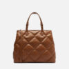 Bolsa tote média marrom. O modelo tem formato estruturado e quadrado, laterais arredondadas e capas em matelassê zig zag. Traz alça lateral regulável, alças de mão bombadas e porta-alça imponente sobre as capas. Possui fecho superior em zíper, puxador em tira e aplicação discreta do nome da marca.