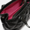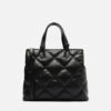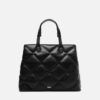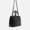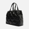 Bolsa tote média preta. O modelo tem formato estruturado e quadrado, laterais arredondadas e capas em matelassê zig zag. Traz alça lateral regulável, alças de mão bombadas e porta-alça imponente sobre as capas. Possui fecho superior em zíper, puxador em tira e aplicação discreta do nome da marca.