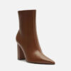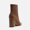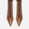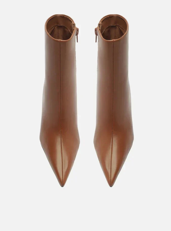 Descrição: Bota feminina marrom de couro. O sapato tem cano curto, salto alto bloco e ponta fina. Traz cabedal ajustado ao pé e fecho em zíper na lateral interna do cano.