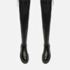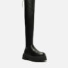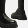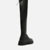 Bota preta tratorada. O modelo tem cano alto que cobre os joelhos, salto médio bloco, base tratorada e bico redondo. Traz cano ajustado às pernas e tira tipo enforcador na parte superior.