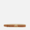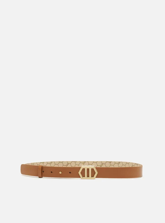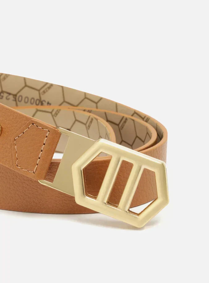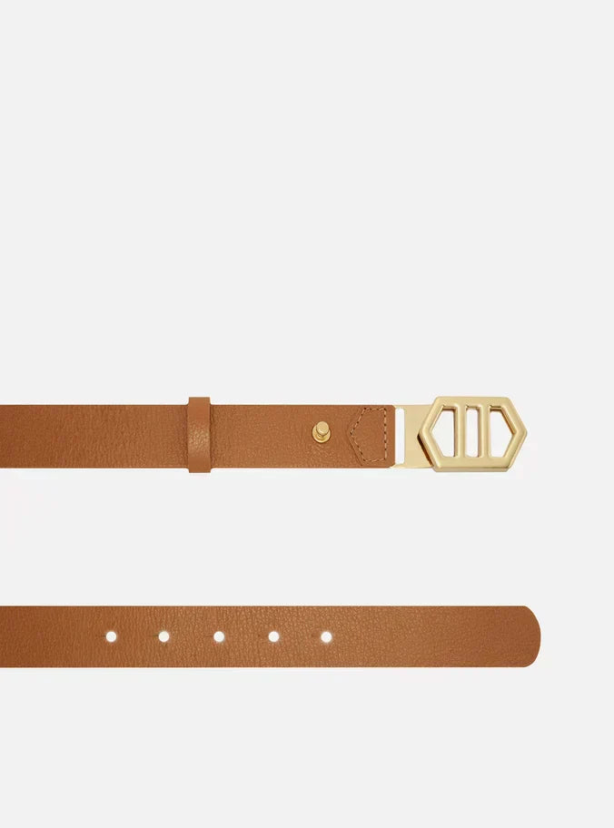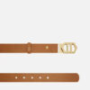 Cinto feminino marrom de couro em tira média. O acessório tem fivela metálica com formato geométrico e vazado. Parte interna em material com monograma Arezzo. Para uso na cintura, é ajustável por carrapeta e tem passador em tira de couro.