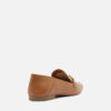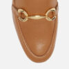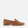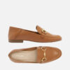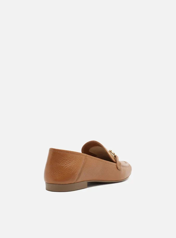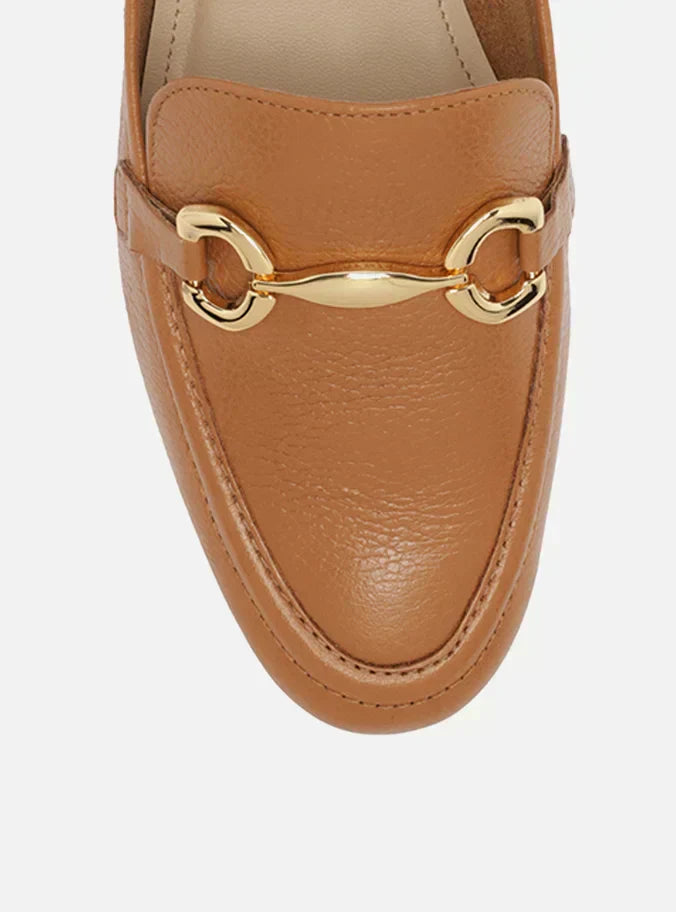 Mocassim feminino marrom de couro. O sapato tem salto rasteiro e formato arredondado na ponta. Fechado, traz recorte lateral na gáspea e aplicação de bridão metálico dourado, preso por tiras, sobre o cabedal. Possui costura marcada no contorno da biqueira. Com palmilha bege e inscrição do nome da marca, exibe toda a parte superior do pé.