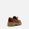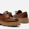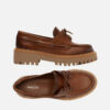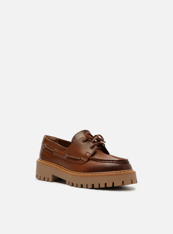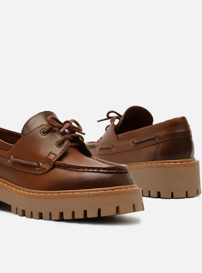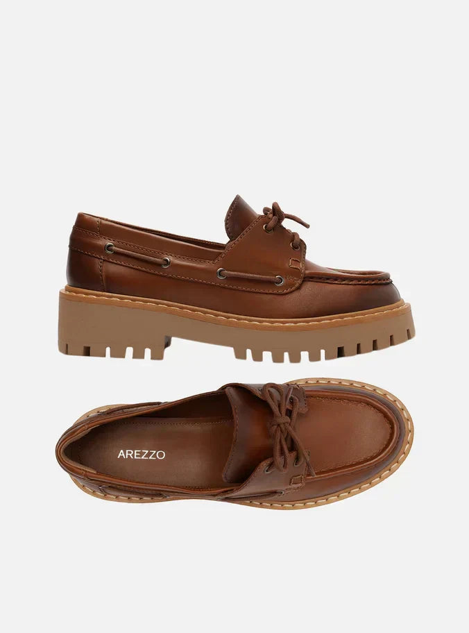 Descrição: Mocassim feminino marrom de couro. O sapato tem salto baixo bloco e formato arredondado na ponta, além de sola emborrachada, tratorada e bipartida em marrom claro e vira no contorno em marrom. Fechado, traz recorte lateral na gáspea e aplicação de cadarço transpassado por ilhoses no contorno, que fecha em amarração sobre o cabedal. Possui costura em pesponto e relevo no contorno da biqueira. Exibe toda a parte superior do pé.