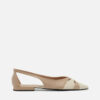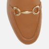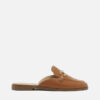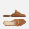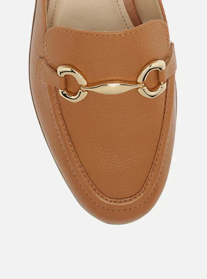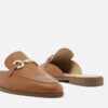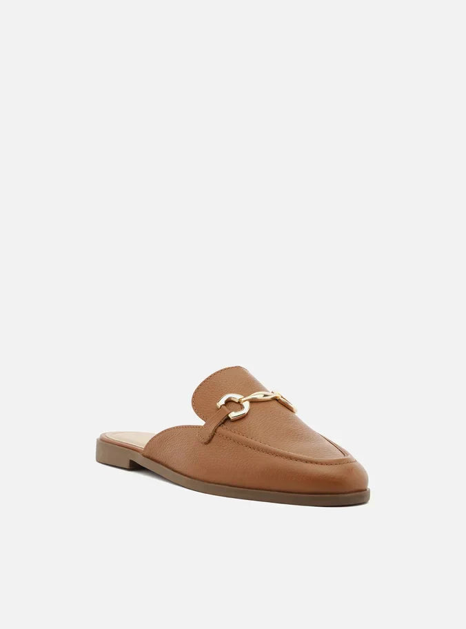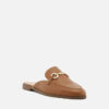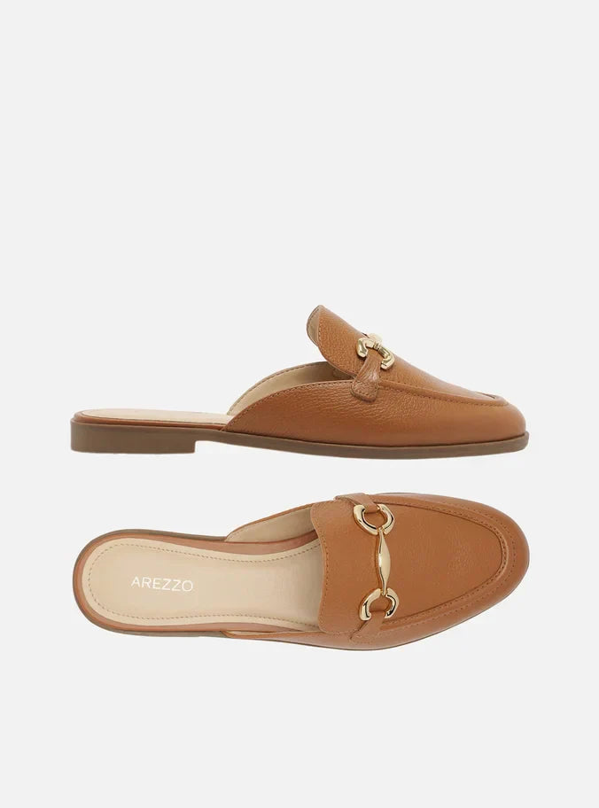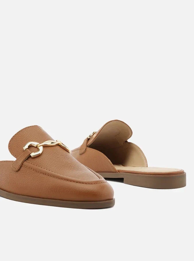 Mule feminina marrom de couro. O sapato tem salto rasteiro e formato arredondado na ponta. Aberta atrás, traz recorte lateral na gáspea e aplicação de bridão metálico sobre o cabedal. Com inscrição do nome da marca na palmilha, exibe a parte superior do pé e calcanhar.