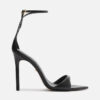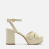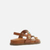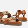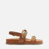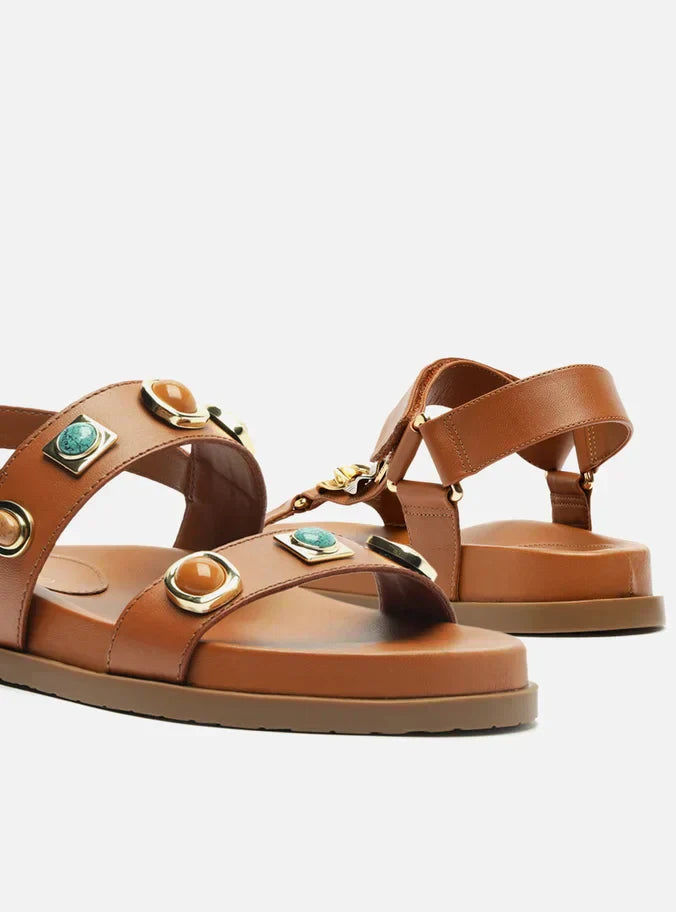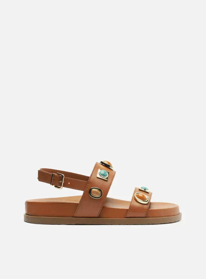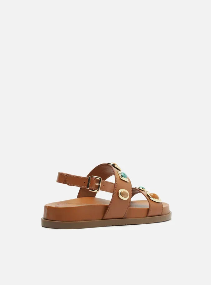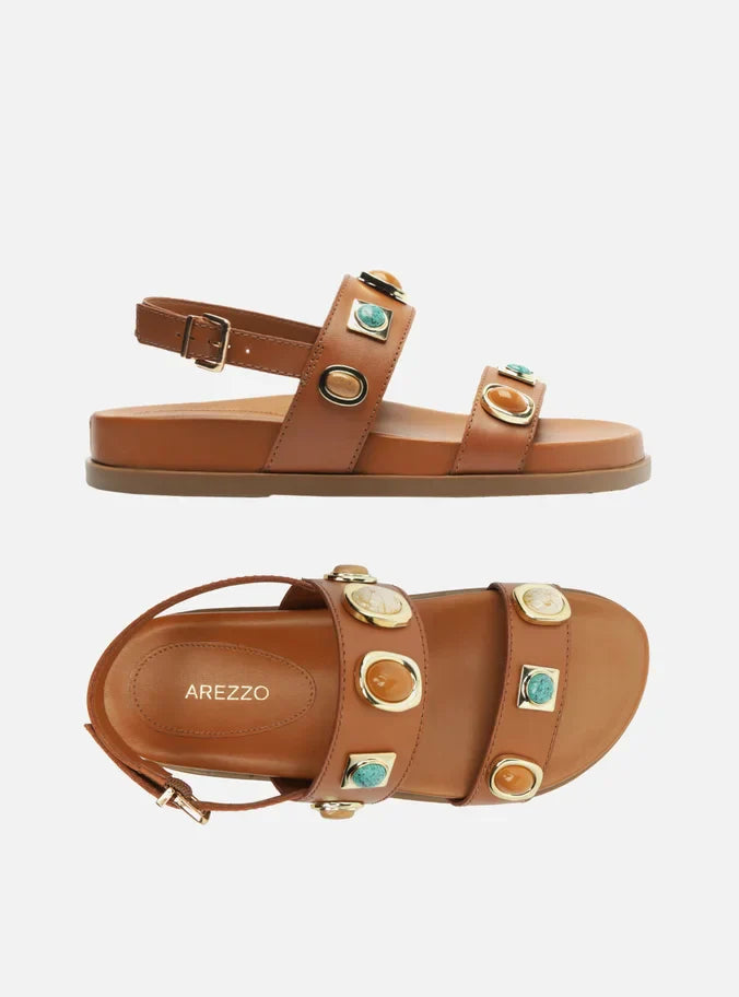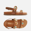 Descrição: Sandália papete feminina marrom de couro. O sapato tem salto rasteiro, palmilha com formato anatômico e inscrição do nome da marca. Possui solado flatform, base emborrachada e formato arredondado na ponta. Traz tira larga sobre os dedos e tira na parte superior do pé, ambas com aplicação de pedras coloridas e contorno em metal dourado, conectada à tira afivelada no calcanhar.