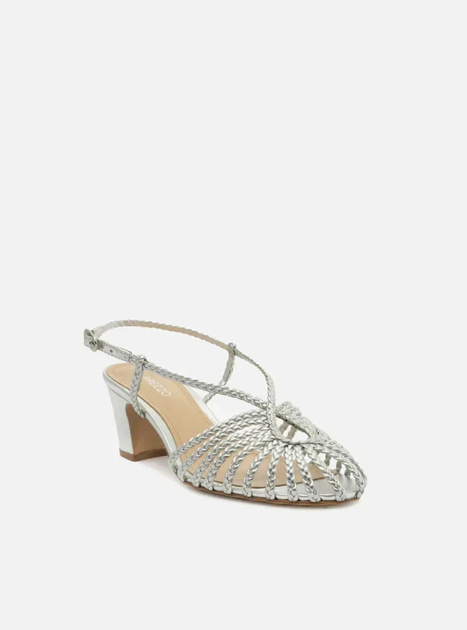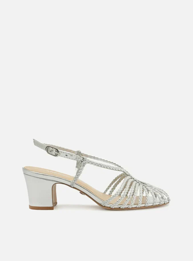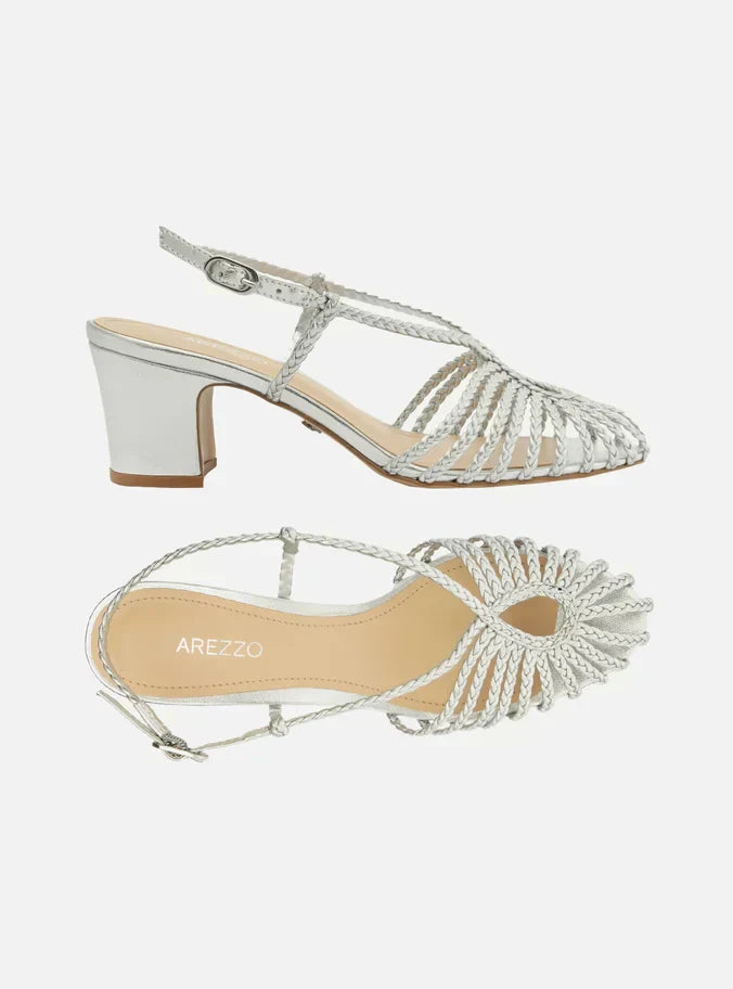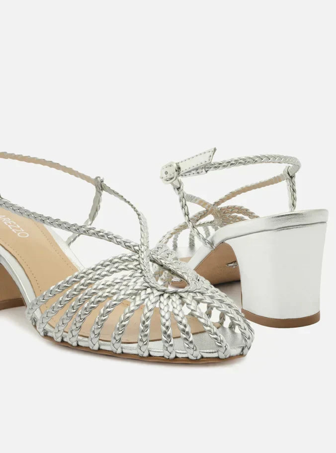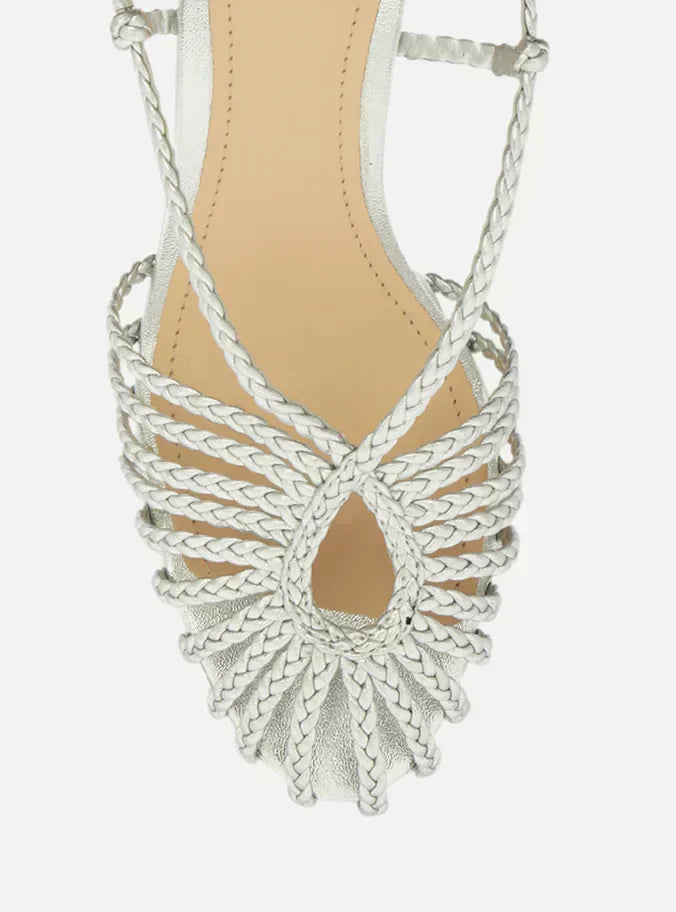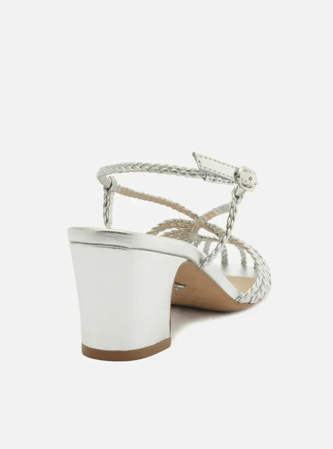 Sandália Prata Salto Bloco Tiras Trançadas Gota