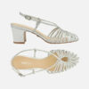 Descrição: Sandália prata. O modelo tem salto baixo bloco e bico redondo. Traz cabedal em tiras finas trançadas, unidas no centro, sobre os dedos e o peito do pé. Duas tiras trançadas seguem até as laterais e se conectam à tira fina no calcanhar com fivela metálica lateral. Com palmilha bege e gravação do nome da marca. A sandália exibe todo o pé.