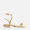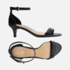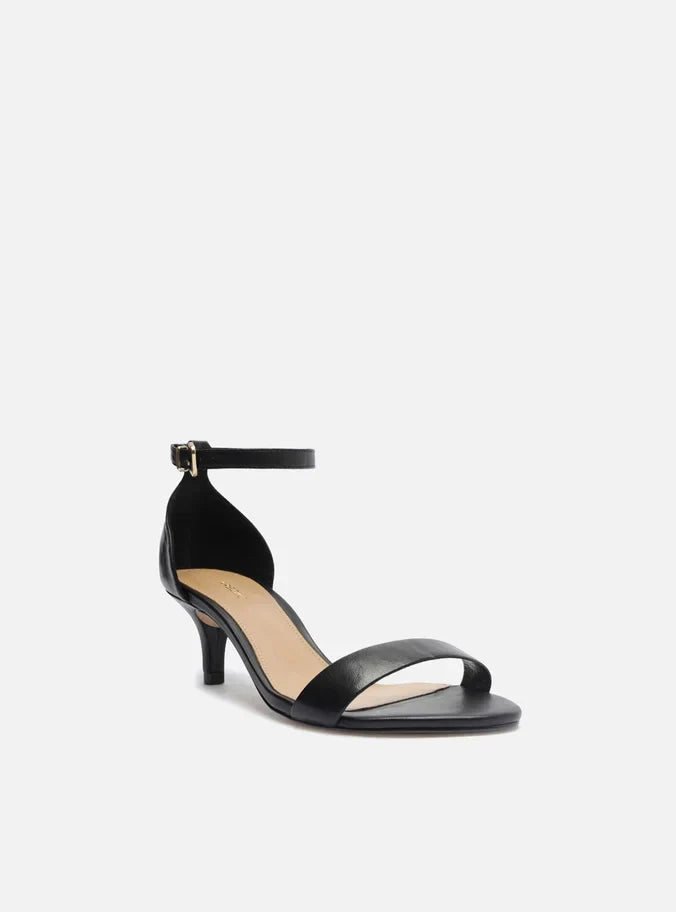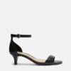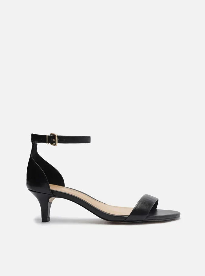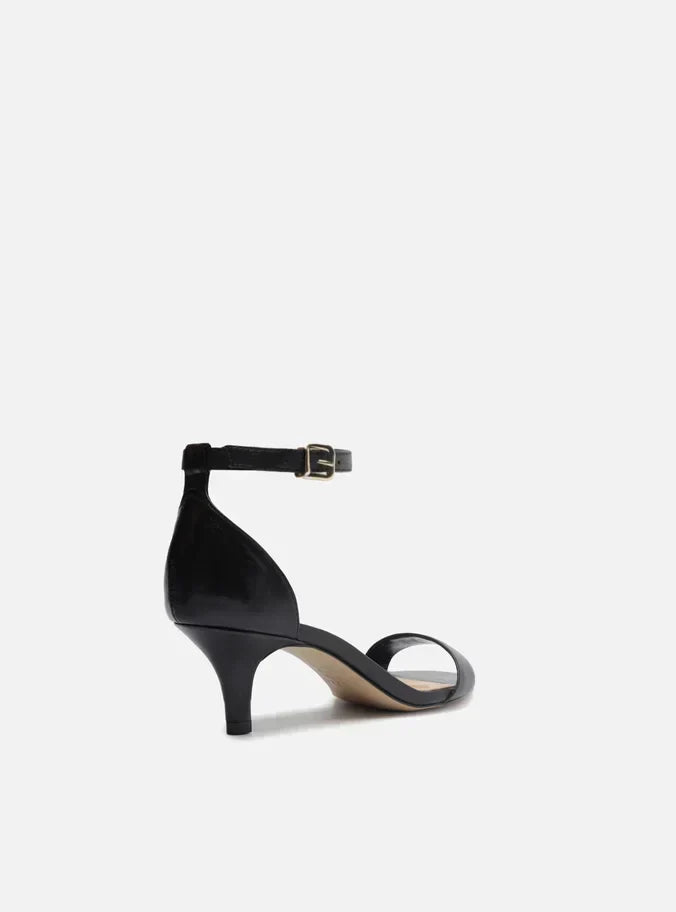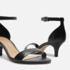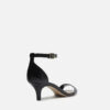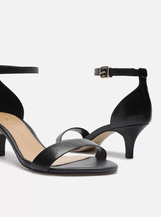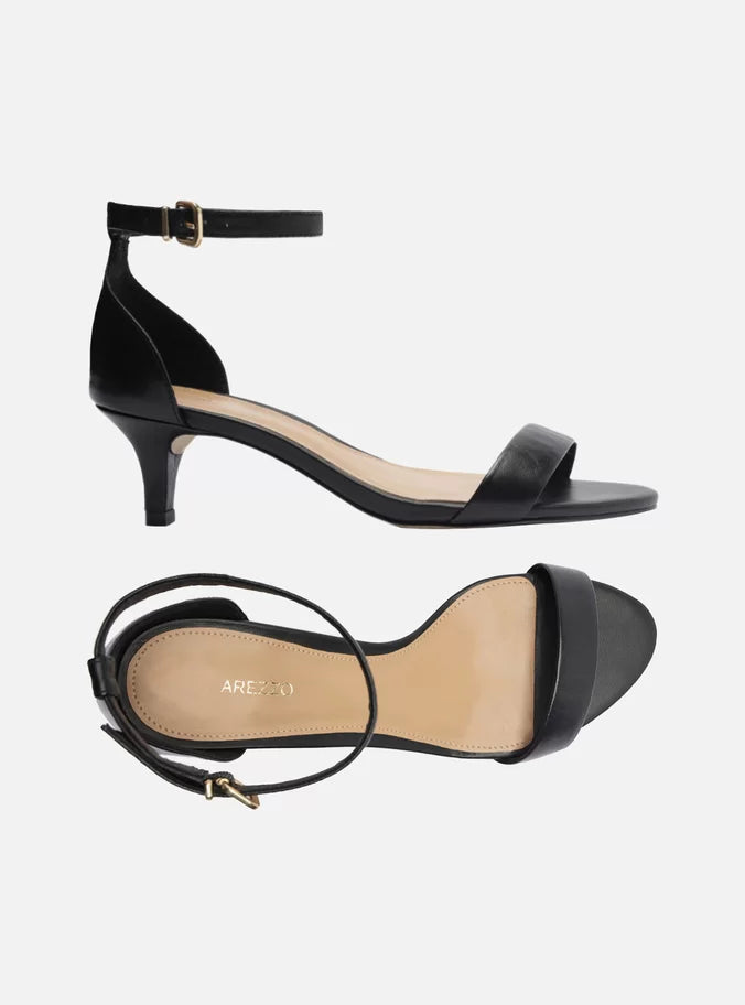 Descrição: Sandália preta de couro. O modelo tem salto baixo fino e bico redondo. Traz tira média sobre os dedos. Fechada no calcanhar, possui tira fina em torno do tornozelo com fivela metálica lateral. A sandália exibe todo o peito do pé e os dedos.