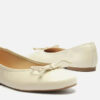 Descrição: Sapatilha Off-white. O modelo tem salto rasteiro e bico redondo. Traz cabedal liso e recorte arredondado sobre o peito do pé. Fechada, possui ainda aplicação de laço pequeno no cabedal. Com palmilha da cor do modelo e inscrição do nome da marca, a sapatilha exibe todo o peito do pé.