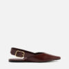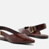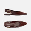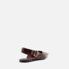 Descrição: Sapatilha vinho em couro. O sapato tem salto rasteiro e ponta fina. Aberta atrás, possui recorte em V no cabedal. Traz tira larga conectada ao cabedal, que segue pela lateral e contorna o calcanhar, e tira larga na outra lateral com fecho em fivela metálica, grande e dourada. Com palmilha da cor da sapatilha e inscrição do nome da marca.