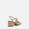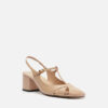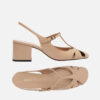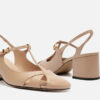 Descrição: Sapato boneca bege de couro. O sapato tem salto médio bloco e formato arredondado na ponta. Possui cabedal recortado e tira central sobre a parte superior do pé. Aberto, traz tira fina conectada ao cabedal que segue pelas laterais e contorna o calcanhar, com elástico, e tira fina na parte superior do pé que fecha em fivela. Com palmilha da cor do sapato e inscrição do nome da marca.