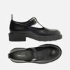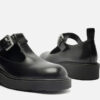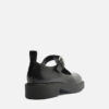 Descrição: Sapato boneca preto em couro. O sapato tem salto baixo bloco e formato arredondado na ponta, além de sola emborrachada. Fechado, traz recorte arredondado nos dois lados do cabedal, tira larga no centro e na parte superior do pé com fecho em fivela grande em uma das laterais.