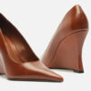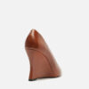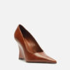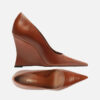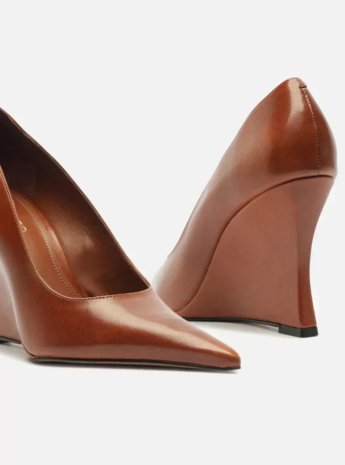 Scarpin feminino marrom caramelo de couro. O sapato tem salto alto anabela e ponta fina. Fechado, traz cabedal com recorte arredondado na parte superior do pé e formato ajustado nas laterais. Com palmilha da cor do sapato e inscrição do nome da marca. Exibe toda a parte superior do pé.