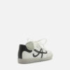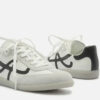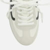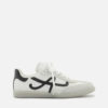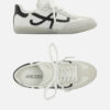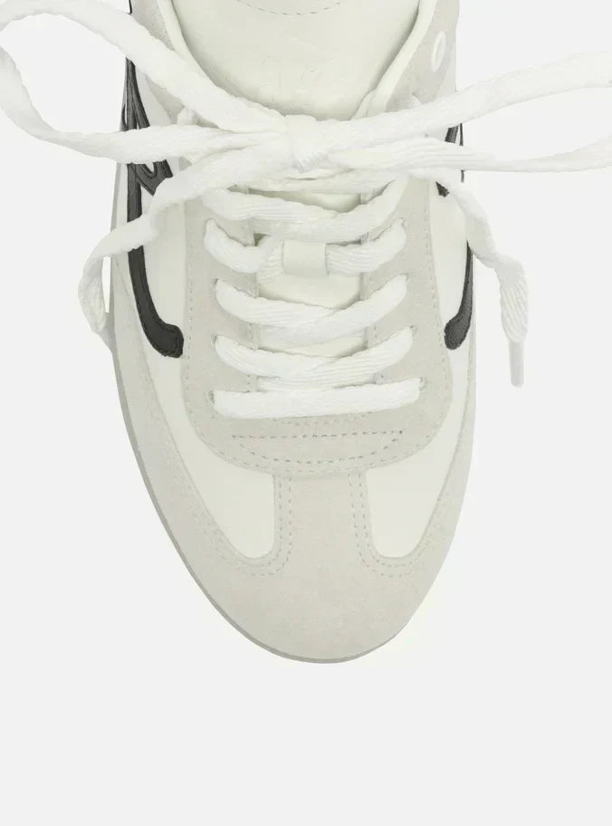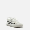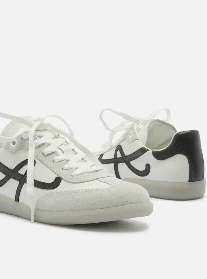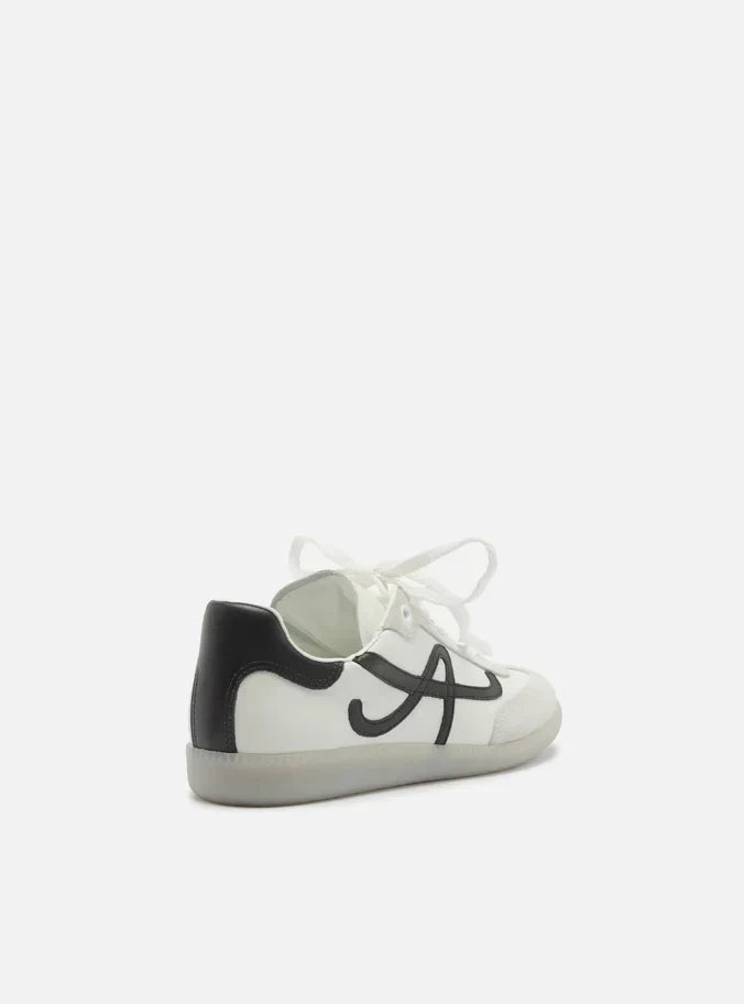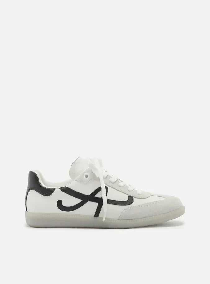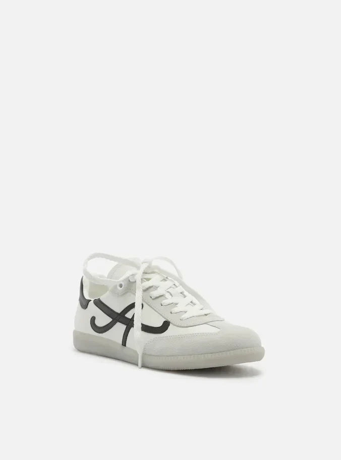 Tênis branco de couro. O modelo de amarração tem solado baixo emborrachado branco. Traz aplicação em couro no contorno da biqueira e no calcanhar e aplicação em forma de A nas laterais. De bico redondo, o tênis tem fecho em cadarços brancos e tag do nome da marca na língua.