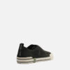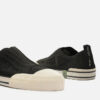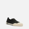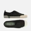 Descrição: Tênis slip on preto em knit. O sapato tem sola baixa emborrachada branca, com frente e biqueira riscadas em borracha, risca preta e tag lateral da logo da Alme. Traz tira em gorgorão com nome das duas marcas no calcanhar, que facilita o calce. Com formato arredondado na ponta, o tênis tem cabedal vazado nas laterais e elástico largo no lugar da língua.